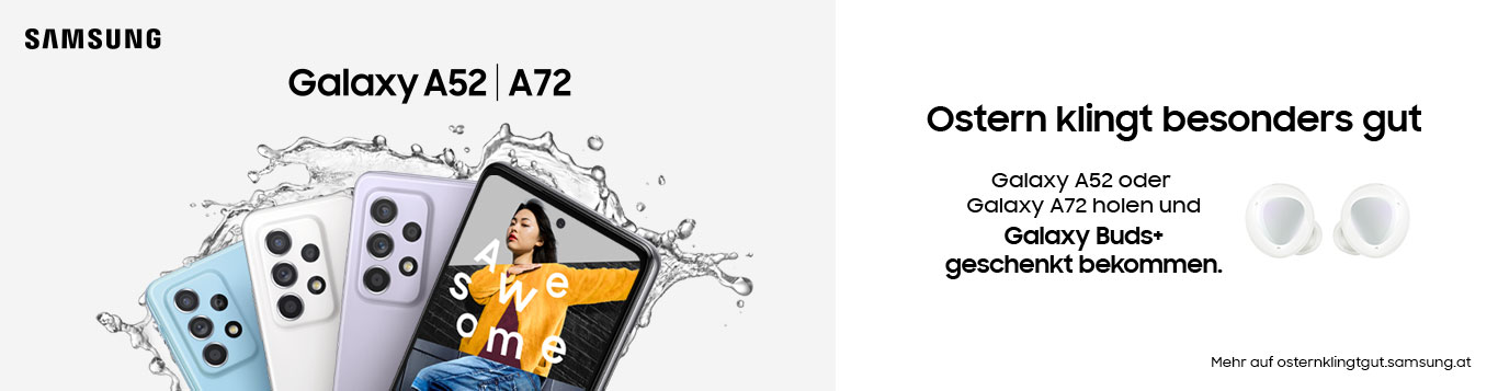 Kaufe im Zeitraum vom 17.03.2021 bis zum 10.04.2021 ein beliebiges Galaxy A52 oder Galaxy A72 Modell in unseren Filialen oder in unserem regionalen eShop. Bitte beachte die genauen Zeiträume in den Teilnahmebedingungen auf osternklingtgut.samsung.at