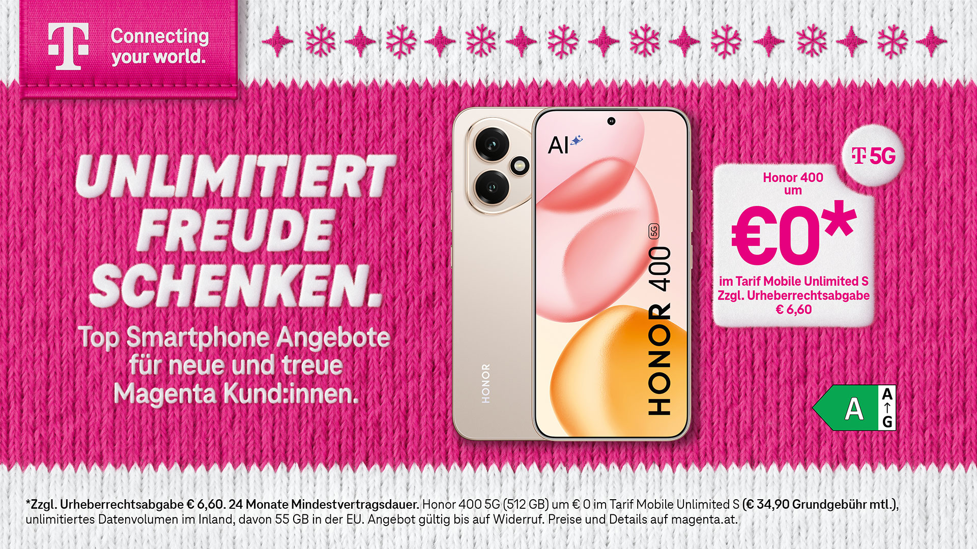 Gültig auf ausgewählte Tarife aller Netzbetreiber bei Abschluss eines neuen Vertrages oder einer Vertragsverlängerung mit einer Mindestvertragsdauer von 24 Monaten. Aktion gültig bis auf Widerruf. Die Angabe „€ 100 geschenkt“ bezieht sich auf den Wert der ausgegebenen Aktionsgutscheine. Eine Barablöse ist ausgeschlossen.